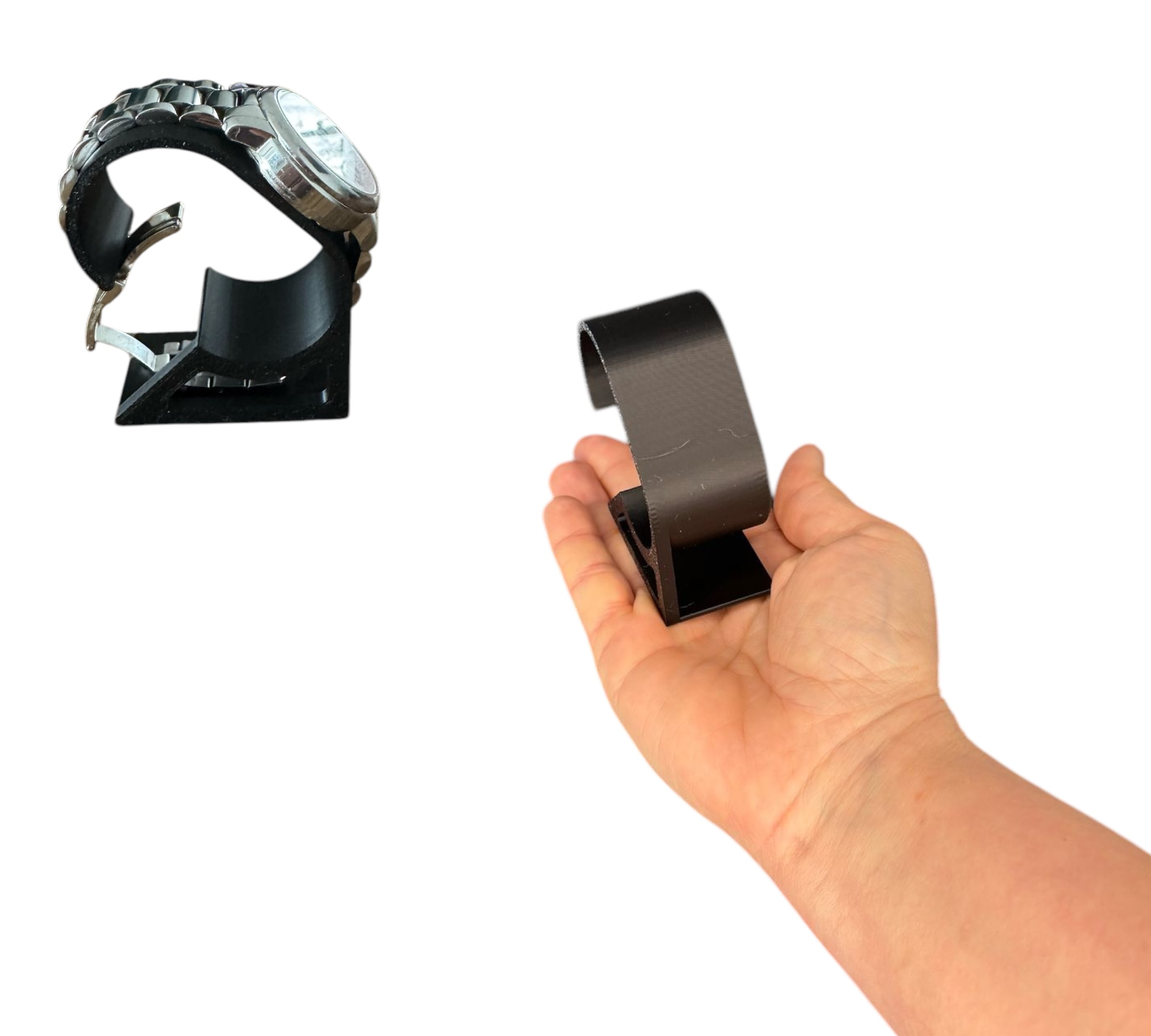 Dzięki unikalnej, zakrzywionej formie stojak doskonale dopasowuje się do kształtu zegarka, zapobiegając jego zsuwaniu się. Może być używany zarówno do klasycznych zegarków na pasku, jak i modeli na bransolecie.